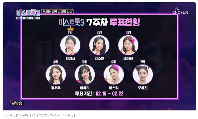 미스트롯3의 7주차에 접어드는 이번주에는 투표가 마감되었는데요 1위는 많은 분들이 좋아하는 빈예서씨가 차지했구요 김소연씨는 2위를 차지했습니다